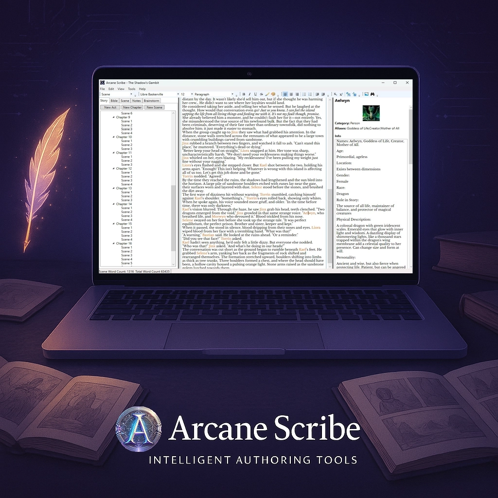 Arcane Scribe seamlessly blends cutting-edge AI with intuitive features to elevate and accelerate your writing process from concept to completion. This powerful desktop application helps you craft rich, engaging stories while preserving your unique creative voice.